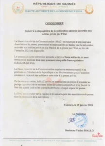 C’est une annonce porteuse d’espoir pour le secteur des médias en Guinée. Dans un communiqué rendu public ce vendredi 9 janvier 2026, la Haute Autorité de la Communication (HAC) a officialisé la mise à disposition de la subvention annuelle destinée aux médias privés ainsi qu’à la Maison de la Presse.
