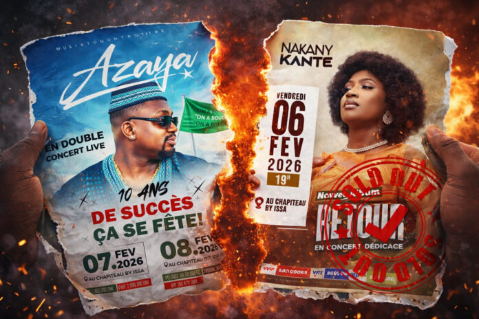 Pour son concert retour au pays prévu le vendredi 6 février 2026, Nakany Kanté a réalisé un sold out de 2 000 places au Chapiteau By Issa, en plein cœur de Conakry. Un fait simple, mesurable, incontestable : 2 000 billets écoulés, salle pleine. Aucun discours, aucune polémique — juste des tickets vendus. Dans le même temps, Azaya, pourtant présenté depuis des années comme la « superstar guinéenne » et célébrant ses 10 ans de carrière avec un double concert annoncé, peine à écouler 2 000 tickets dans cette même capitale et au même endroit, et ce depuis plusieurs semaines. La question n’est pas celle du talent, débat subjectif par essence, mais celle de la mobilisation réelle. Une star, au sens strict, se définit par sa capacité à rassembler spontanément, surtout dans sa zone de confort. Or, le contraste est saisissant : Nakany Kanté remplit, Azaya struggle. Le terrain parle.