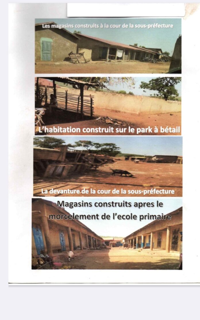 Le document allègue le lotissement et la vente illégaux de dépendances du domaine public, notamment la cour du siège de la sous-préfecture et celle de l’école primaire de Kollet. Ces espaces auraient été transformés en plus de 50 boutiques vendues à des particuliers à environ 15 millions GNF l’unité, sans reversement dans les comptes communaux.